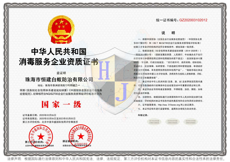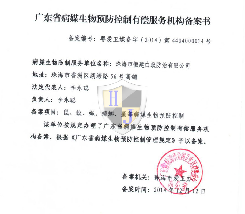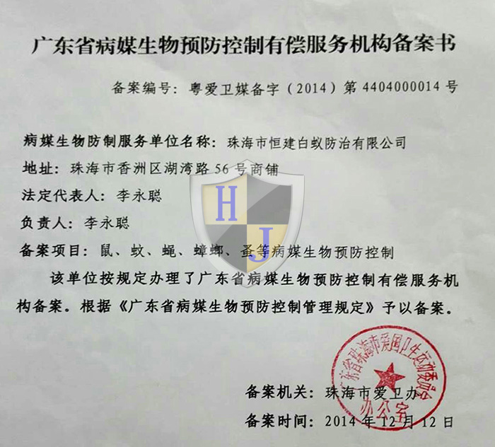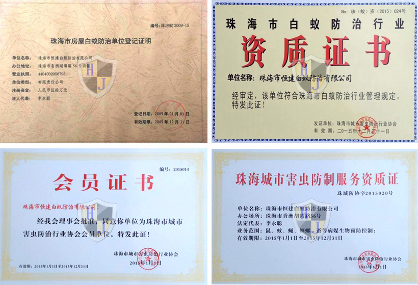 經多年專注誠信經營,公司獲得國家級有害生物防制A級資質證書、國家級消毒一級資質證書,通過廣東省病媒生物預防控制備案、市愛衛辦頒發病媒生物備案證明、廣東省守信用重合同企業榮譽、城市蟲害行業等多項資質。