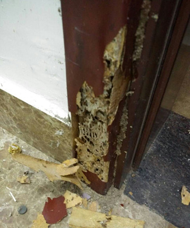 當(dāng)日,李師傅在張女士家中發(fā)現(xiàn),她家里的木質(zhì)家具較多。據(jù)介紹,她入住該房屋才兩年時(shí)間,前幾日中午回到家時(shí),不經(jīng)意間用手觸摸到自家房門套表皮,感覺(jué)有點(diǎn)異樣,用手指使勁一摁,居然癟了下去。接著撕開門套表皮發(fā)現(xiàn),一大堆白蟻正在啃噬著門框,嚇了張女士一大跳。